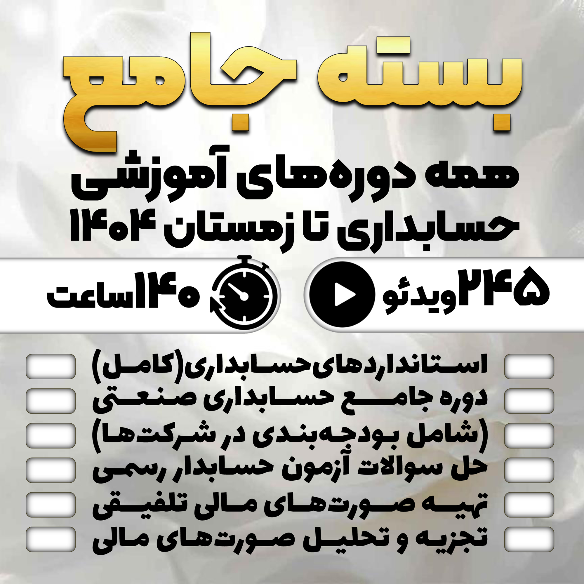 این بسته آموزشی جامع (۲۴۵ ویدئو مجموعا به مدت ۱۴۰ ساعت) شامل همه مجموعه ویدئوهای آموزشی تولیدی آکادمی با موضوعات حسابداری، گزارشگری مالی و تحلیل مالی تا زمستان ۱۴۰۴ است (شامل، «استانداردهای حسابداری (کامل)»، «حل تشریحی سوالات حسابداری (مالی و صنعتی) در آزمون حسابدار رسمی سالهای ۱۳۹۸ تا ۱۴۰۳»، «تهیه صورتهای مالی تلفیقی»، «تجزیه و تحلیل صورتهای مالی»، و «دوره جامع حسابداری صنعتی (شامل بودجهبندی در شرکتها)»). مجموع قیمت خرید جداگانه این شش دوره آموزشی مبلغ ۱۲.۴۰۰.۰۰۰ تومان است، که در این بسته جامع با ۲۰% تخفیف به مبلغ ۹.۹۰۰.۰۰۰ تومان در دسترس علاقهمندان قرار دارد. این بسته مناسب افرادی است که قصد تهیه همه دورههای آموزشی فوق را دارند؛ و در قالب این بسته میتوانند آنها را با ۲۰% تخفیف بیشتر تهیه کنند. توضیح مهم: ویدئوهای گنجاندهشده در این بسته با تغییرات بعدی در منابع آموزشی بروزرسانی میشوند و بطور رایگان در اختیار همه خریداران قبلی قرار داده میشوند. ولی چنانچه در آینده دورههای آموزشی جدیدی به این بسته اضافه شود، باید بطور جداگانه خریداری شود.