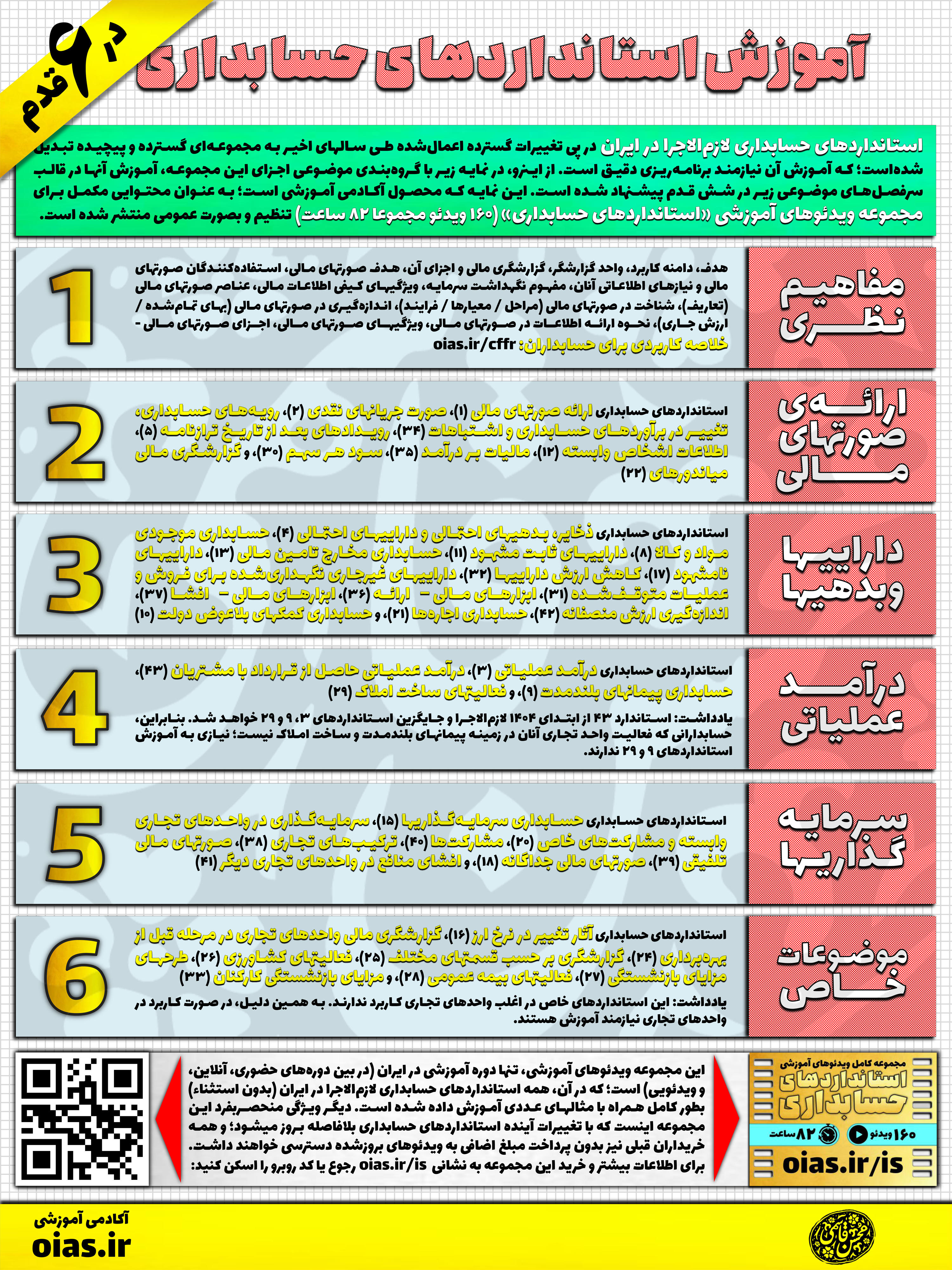 استانداردهای حسابداری لازمالاجرا در ایران، در پی تغییرات گسترده اعمالشده طی سالهای اخیر (از 1398)، به مجموعهای گسترده و پیچیده تبدیل شدهاست؛ که آموزش آن نیازمند برنامهریزی دقیق است. از اینرو، در نمایه زیر با گروهبندی موضوعی اجزای این مجموعه، آموزش آنها در قالب سرفصلهای موضوعی زیر در شش قدم پیشنهاد شده است. این نمایه که محصول آکادمی آموزشی است؛ به عنوان محتوایی مکمل برای مجموعه ویدئوهای آموزشی «استانداردهای حسابداری» (160 ویدئو مجموعا 82 ساعت) تنظیم و بصورت عمومی منتشر شده است.